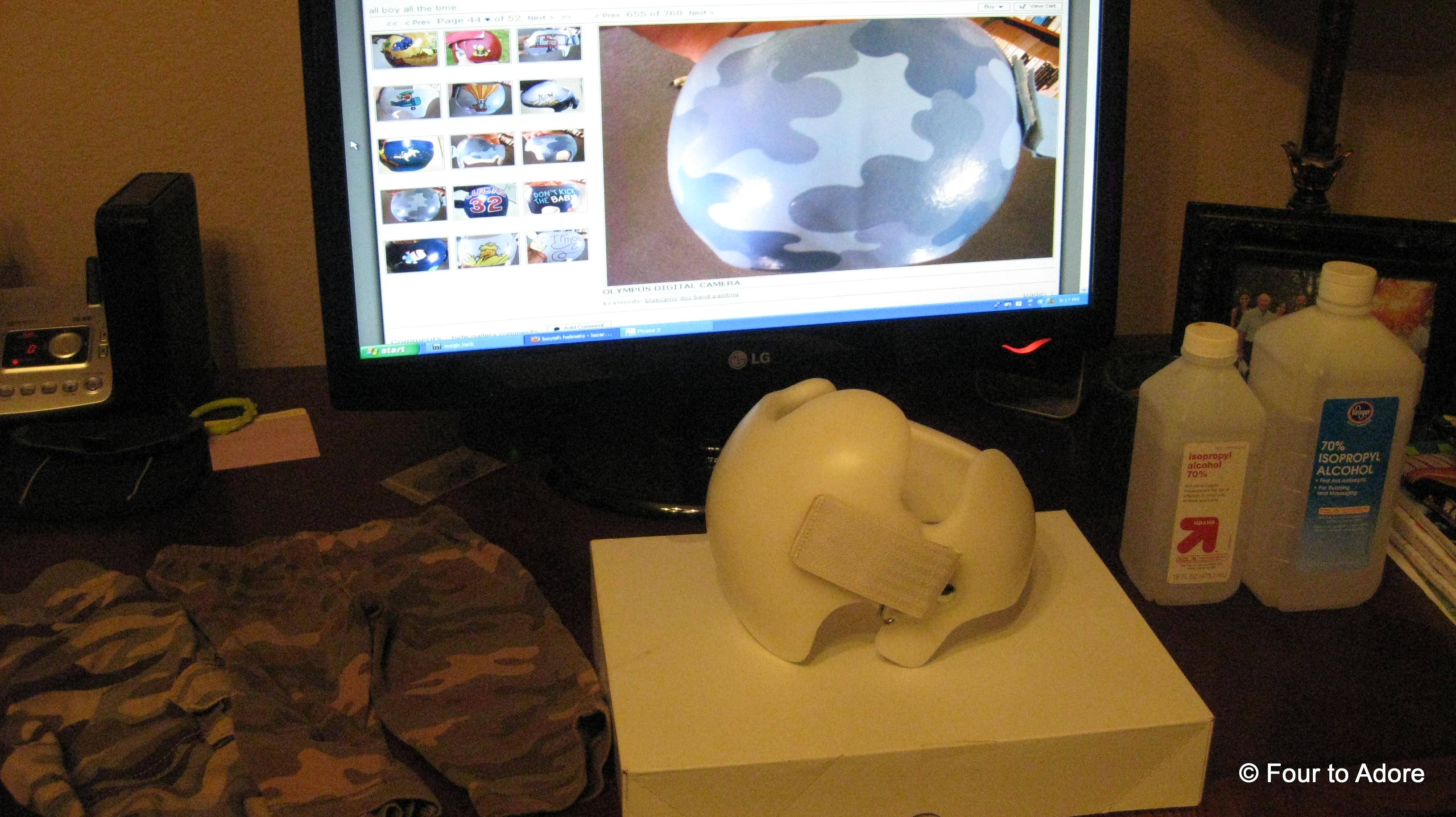 While Mason enjoyed his final night of slumber sans DOC Band, George got busy painting a mini masterpiece.  He found a website with samples of painted bands and used a pair of the boy’s camo pants as inspiration.  The end result was exactly as I envisioned.