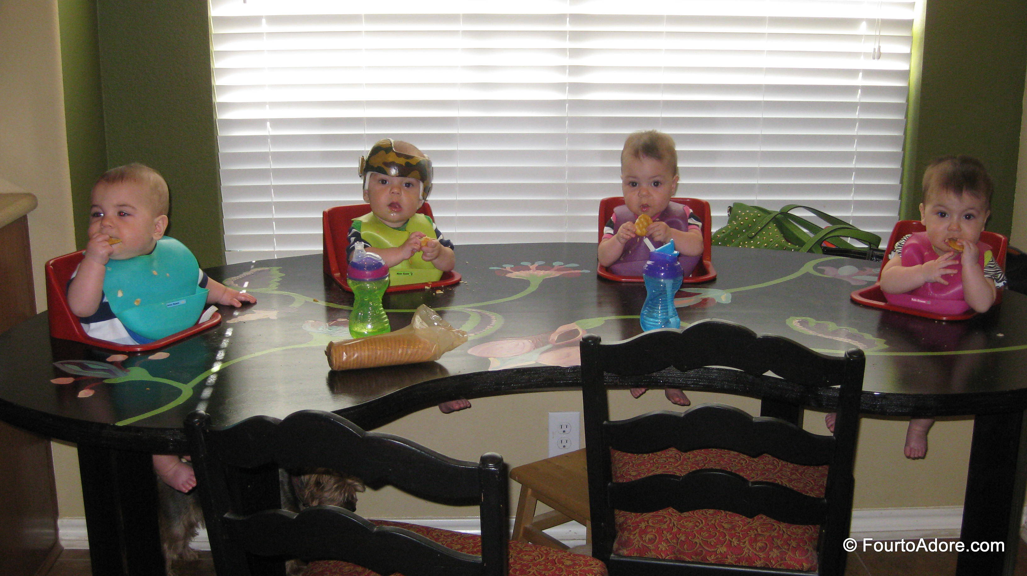 I totally snagged the idea of feeding the babies Ritz from Amber. They LOVED them! Funny thing, the boys crammed them in their mouths like Cookie Monster while the girls nibbled them like little ladies. We are just steps away from a food fight and tea party, I think.