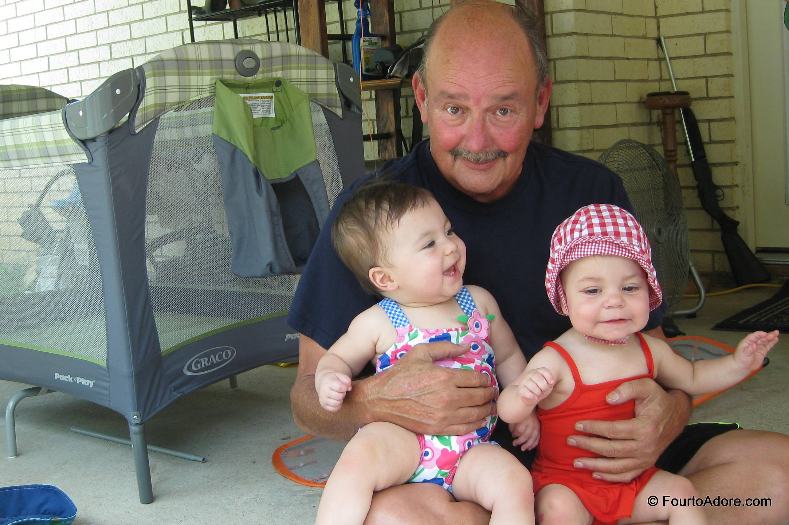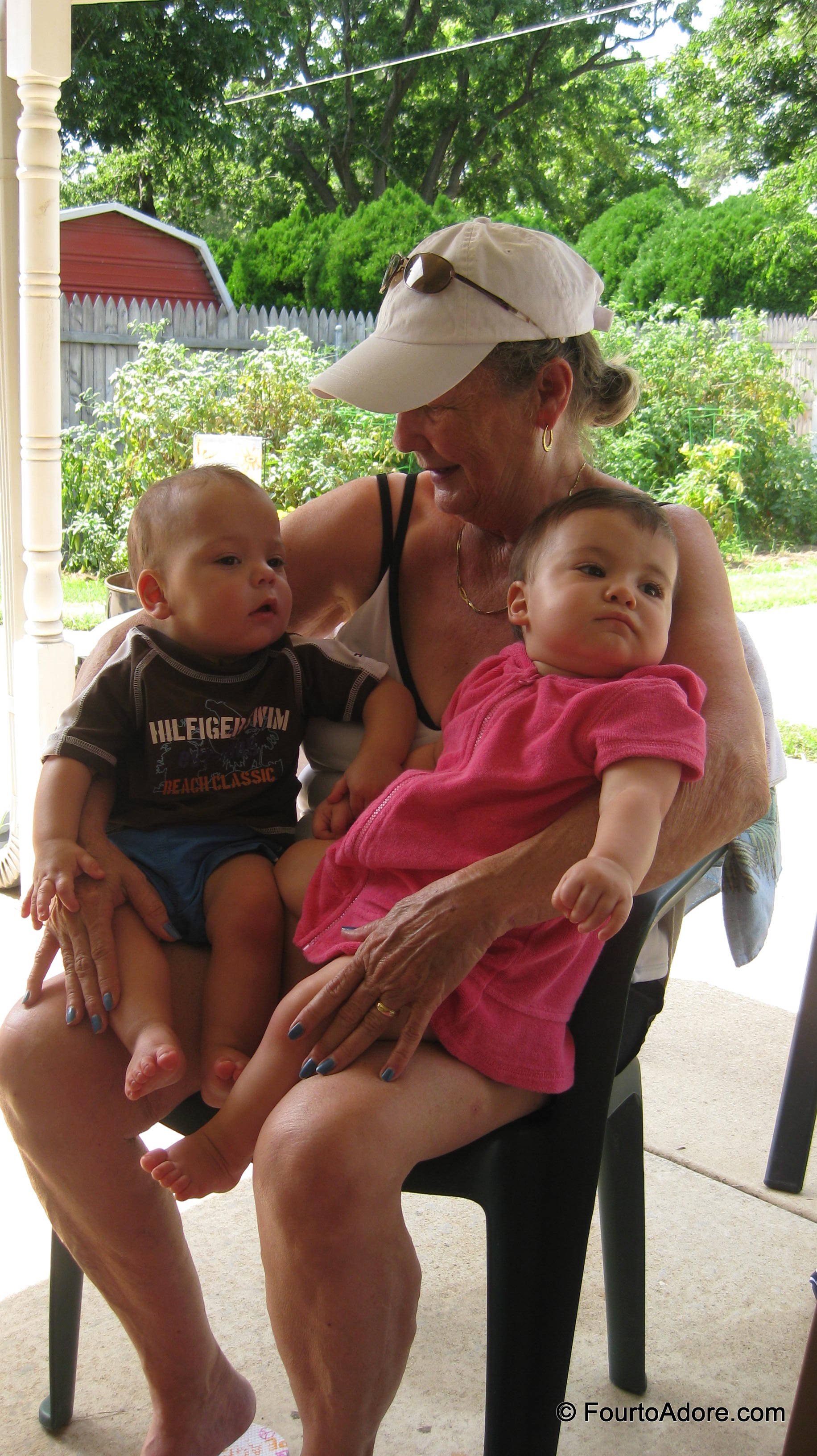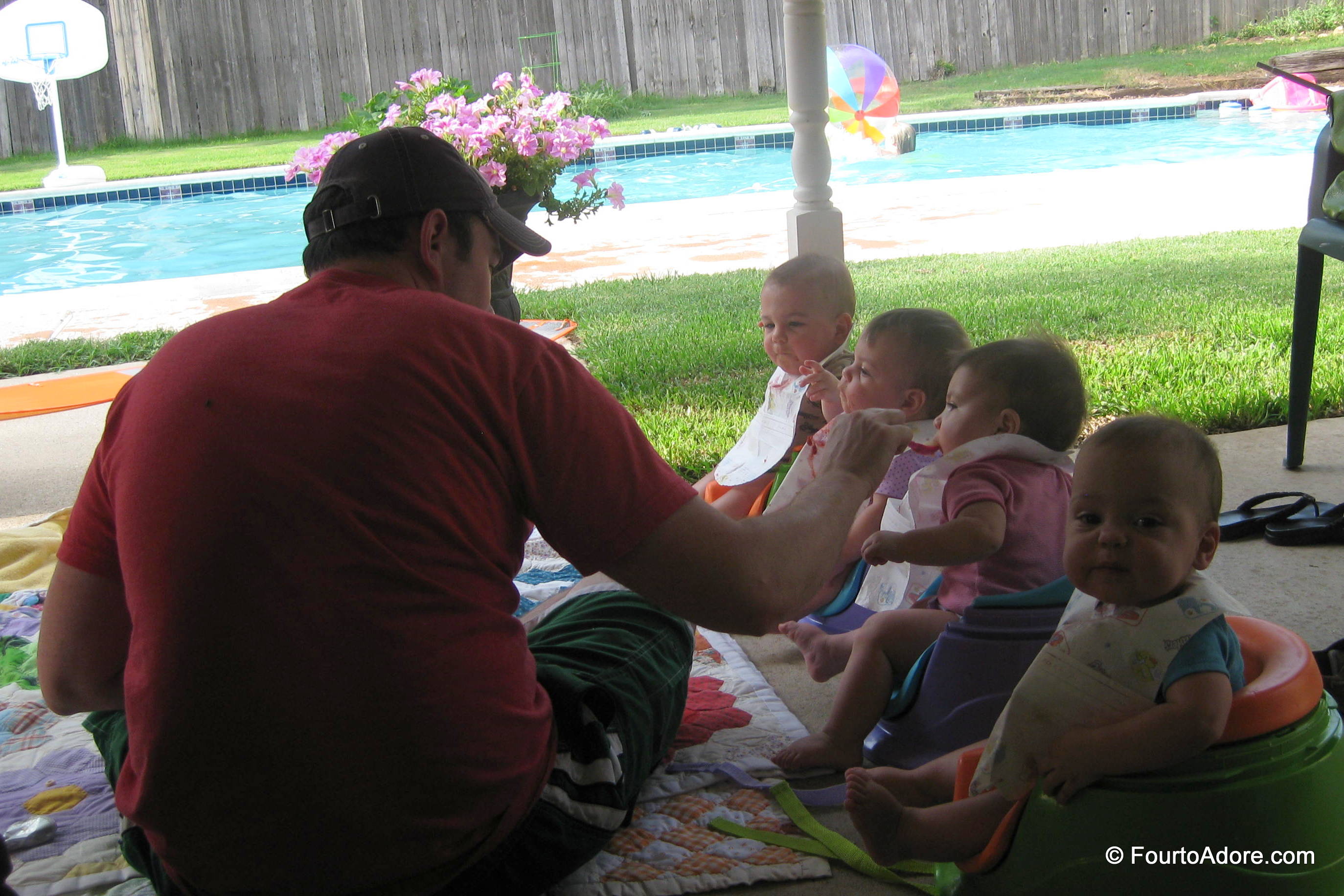 On Sunday, the babies enjoyed another field trip. This time, to Grandaddy’s house for a dip in the pool. He has an in ground pool so it was a true swim this time. Mason wasn’t keen on the crisp water, but was content to float in an inflatable boat or snuggle in my arms. The other babies happily splashed and kicked in their respectable rafts. After swimming, we changed them into dry diapers and pajamas in an assembly line then served up a delicious meal. Following dinner, the babies enjoyed some poolside entertainment as George’s cousin, Brandi, practiced diving. The babies gawked in amazement for well over 20 minutes allowing us time to clean up and load the van. They may have well enjoyed the show over Baby Einstein!