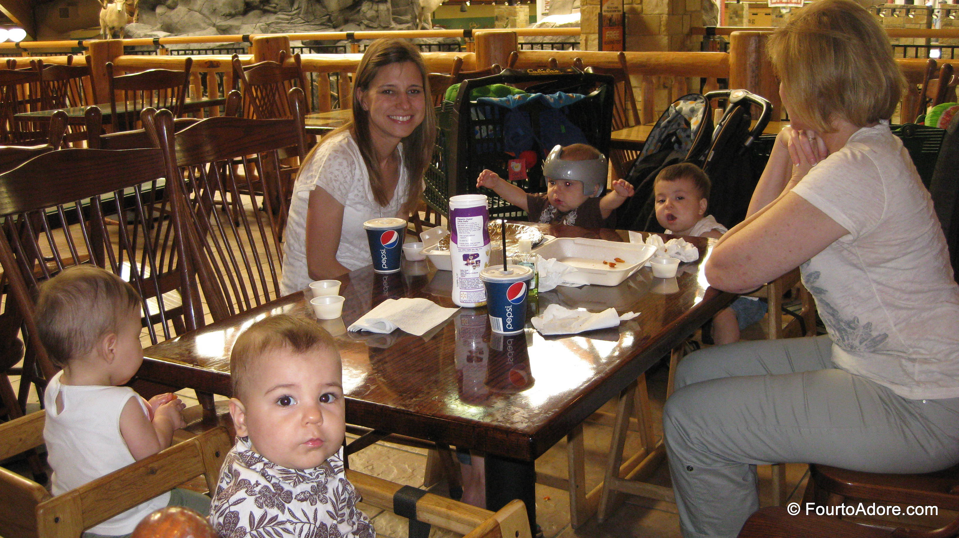 Friday, we ventured to Cabela’s, which is only minutes from our home. I’m not much of an outdoorsy gal, but Cabela’s is FREE, indoors, and best of all air-conditioned. We spent well over an hour showing the babies the taxidermy zoo and aquarium. We then enjoyed noshing on some sweet potato fries. The babies especially loved this snack and three of them signed “more” repeatedly. While Sydney didn’t sign, she vocalized that she enjoyed her snack too. Sydney isn’t terribly interested in signing, but she babbles so much, I expect she may just say, “MORE” one day.