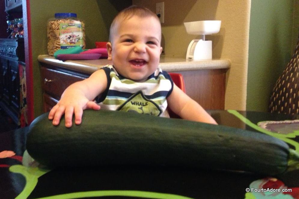 A few days ago, we got a chuckle out of his latest harvest. After a few minutes piddling in the garden, George strutted into the house hauling a 5.5 pound zucchini. To put it in perspective, this monster weighed more than any of our babies at birth. Now that is one enormous zucchini! George presumed this thing would be too woody for consumption due to it’s extended time on the vine. One thing I detest is waste. I wasn’t going to let a perfectly good zucchini go unused if I could help it. The next day I sliced it and found it to be tender and mild even raw. This particular one ended up being steamed then mashed into a gallon of baby food. The babies have enjoyed several zucchini medleys including: zucchini + apple + cinnamon, zucchini + apple + banana, and zucchini + tomatoes. I may have used up the big mama jamma for the babies, but we also had quite a few smaller zucchini to contend with.
