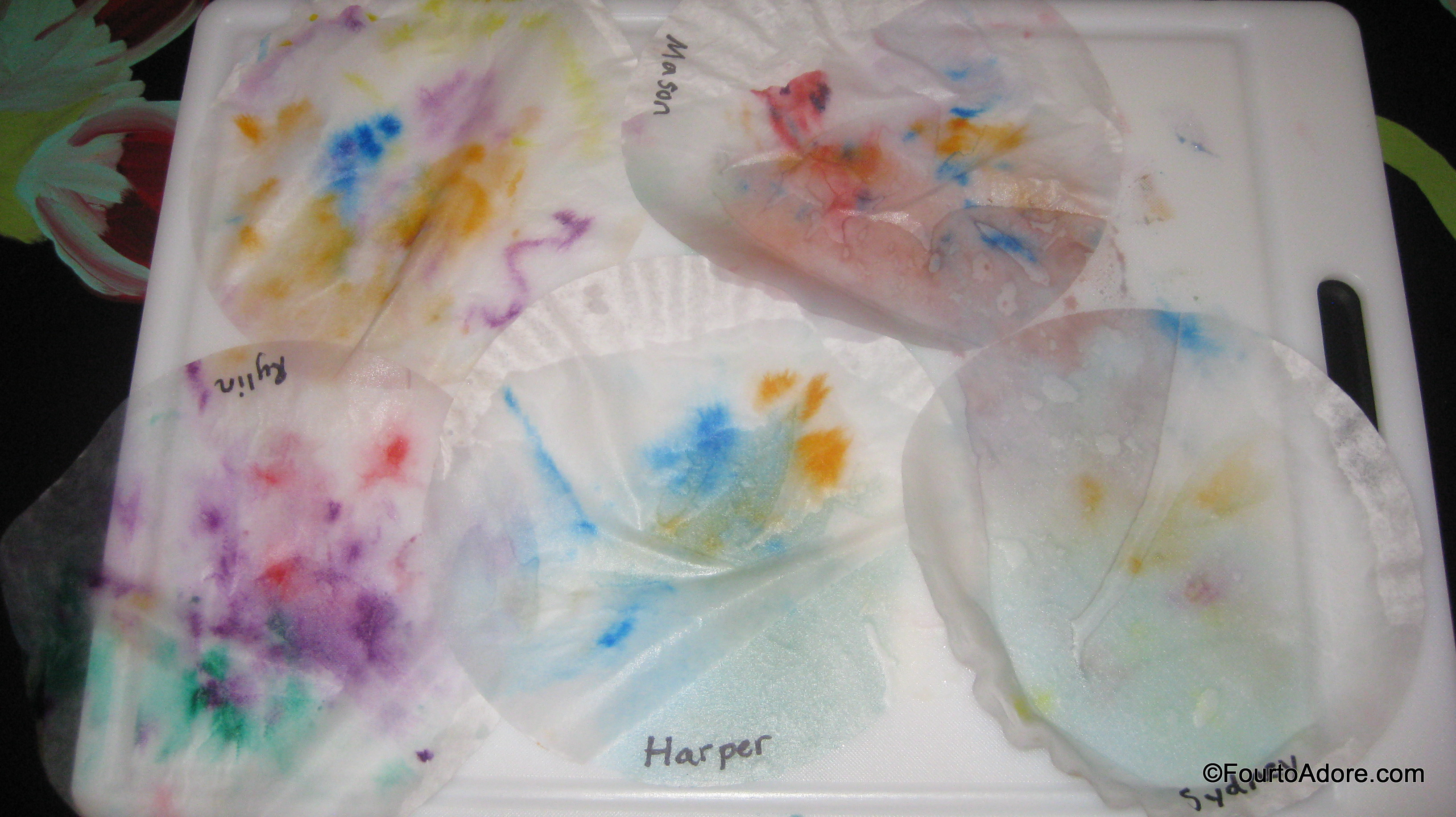 I sprayed the coffee filters with water to make the marker run, creating a watercolor effect. After the filters were dry, I pinched the middles together and wrapped them with pipe cleaners to create our butterflies.