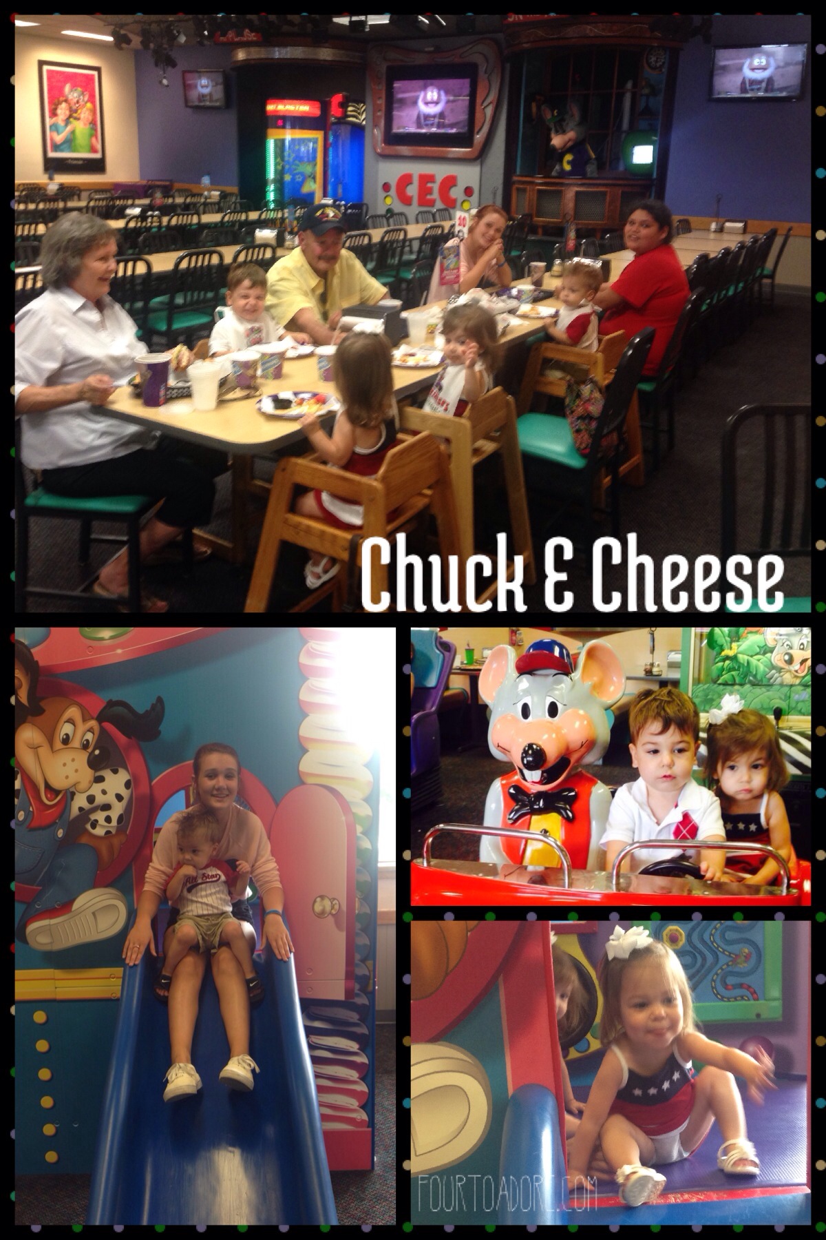 Dancing time with Chuck E. Cheese (the quads loved chasing him and playing follow the leader)