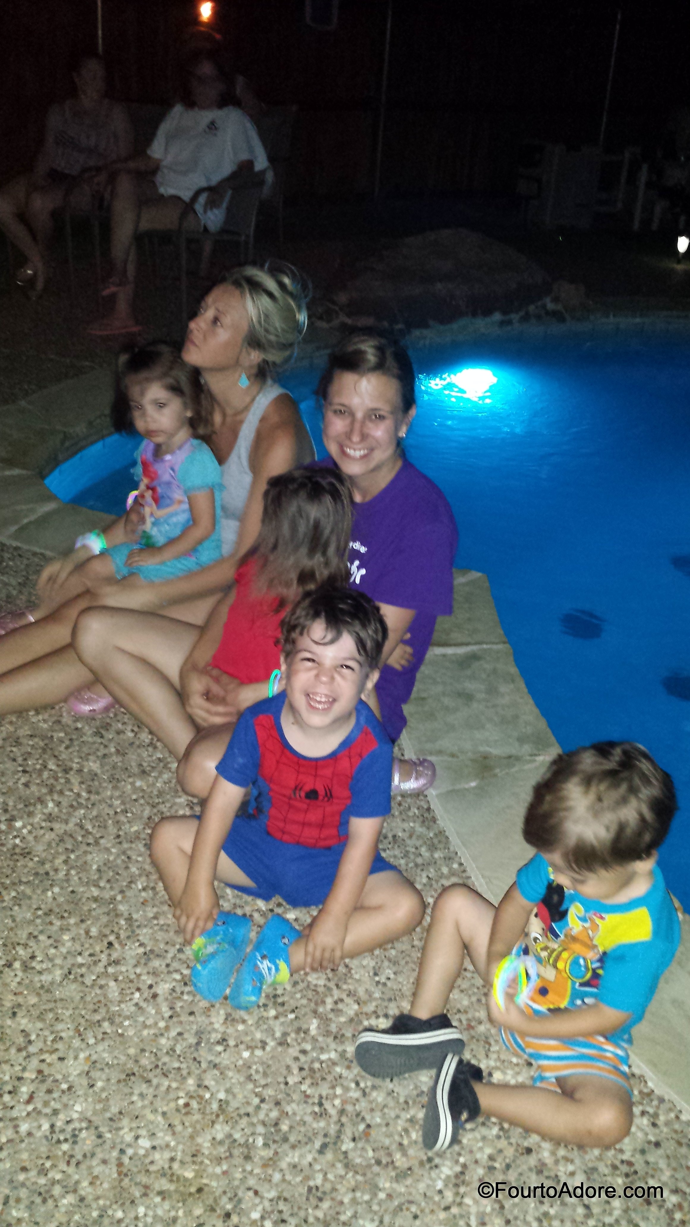 As we enjoyed our s’ mores, several of the neighbors began shooting off small fireworks, and I braced myself for pandemonium. Much to my surprise, the quads seemed okay with the commotion. By then, they were already up at least an hour past bedtime and seemed content, so we let them gaze at poolside fireworks. Sydney became upset at some of the loudest fireworks, but was content to snuggle with me.