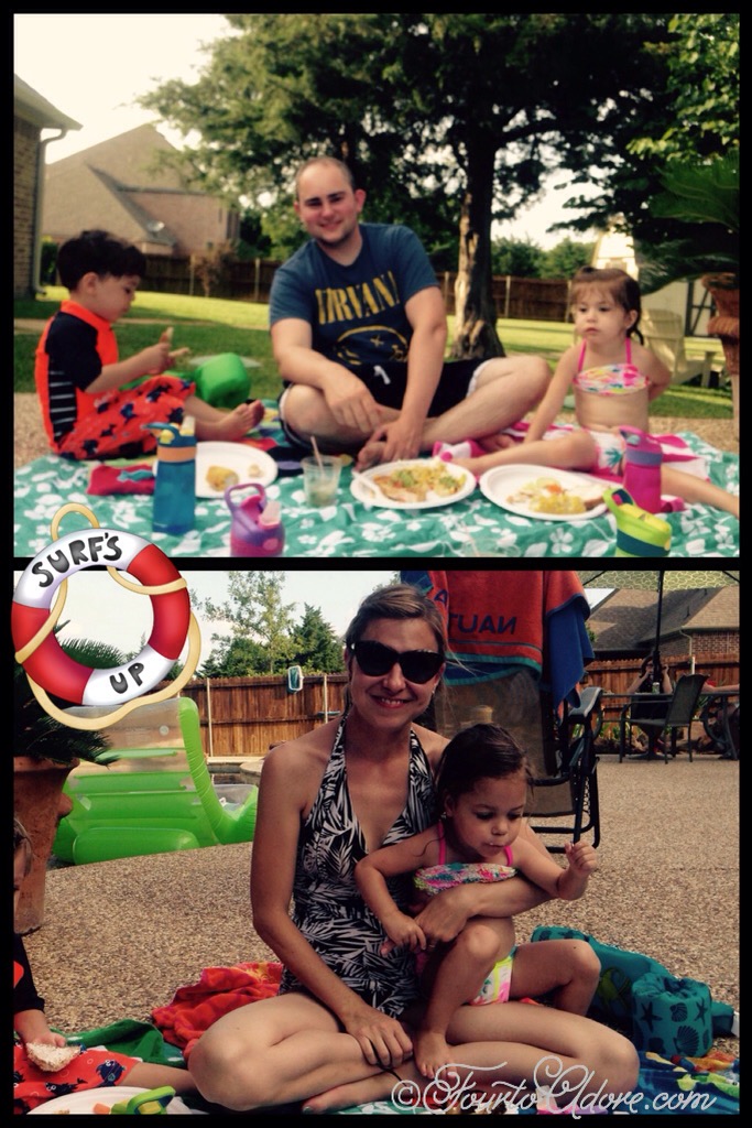 Once everyone’s fingers and toes had a raisin like appearance, we bailed out of the pool for an evening picnic. Apparently the quads worked up an appetite splashing around. They devoured dinner and had plenty of room for dessert!