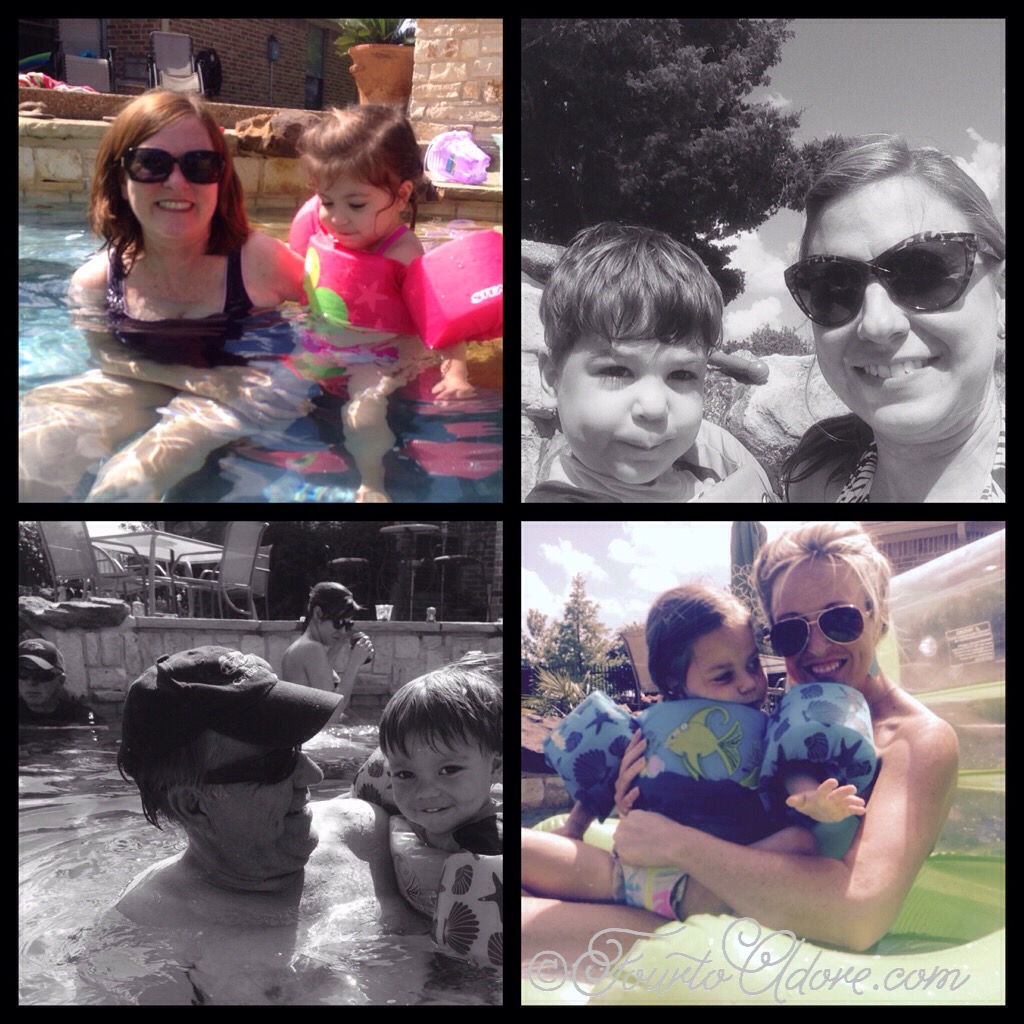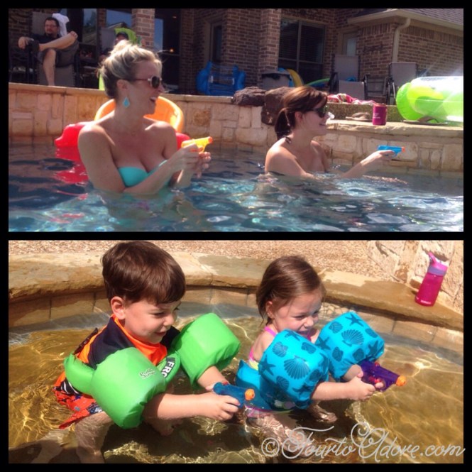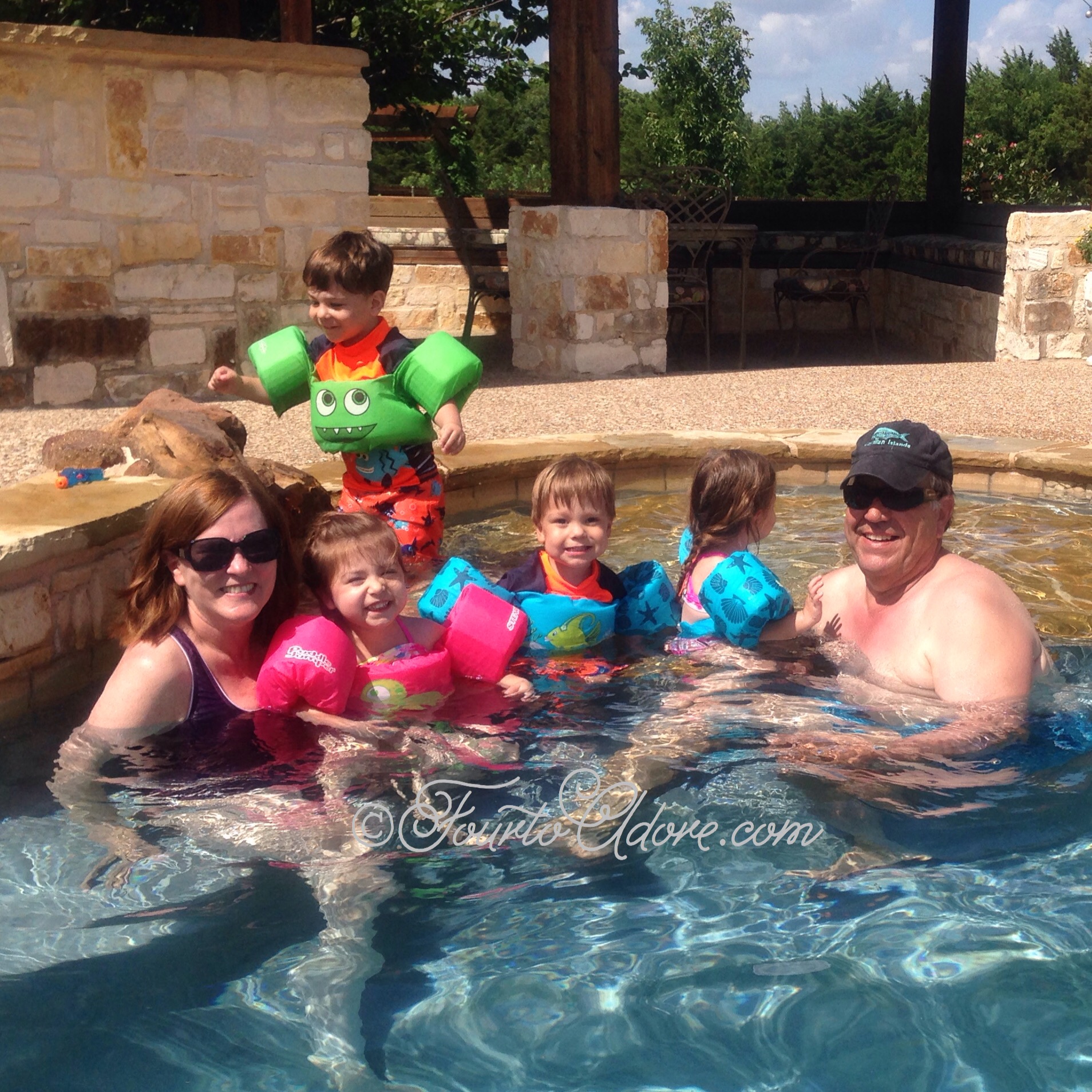 Before letting the quads outside the confines of the house, I began strapping each one in a puddle jumper. Naturally, Rylin protested her aqua colored version, stripping it off multiple times. Billie happened to have a hot pink one available and a disaster was averted. I’m nervous about the kids near water with puddle jumpers, having them near water without them is a total nightmare. At first, the kids were hesitant to get into the pool, but with many familiar adults handy, they decided it was worthwhile.